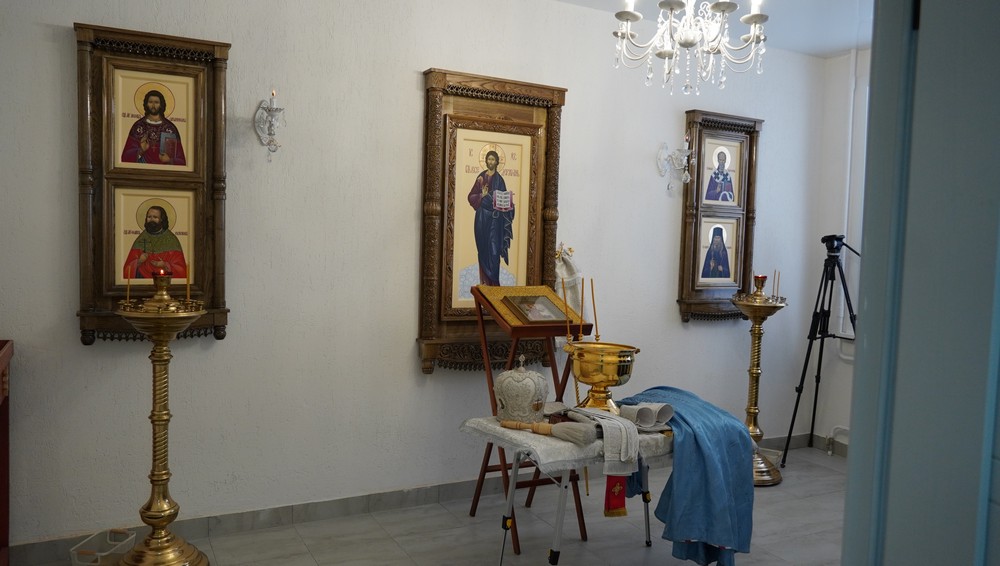 Стены новоосвященной часовни украшают киоты, сделанные заключенными, которые получили на это благословение. На иконах можно увидеть хабаровских святых - священномучеников Леонида Серебренникова и Филиппа Распопова.
